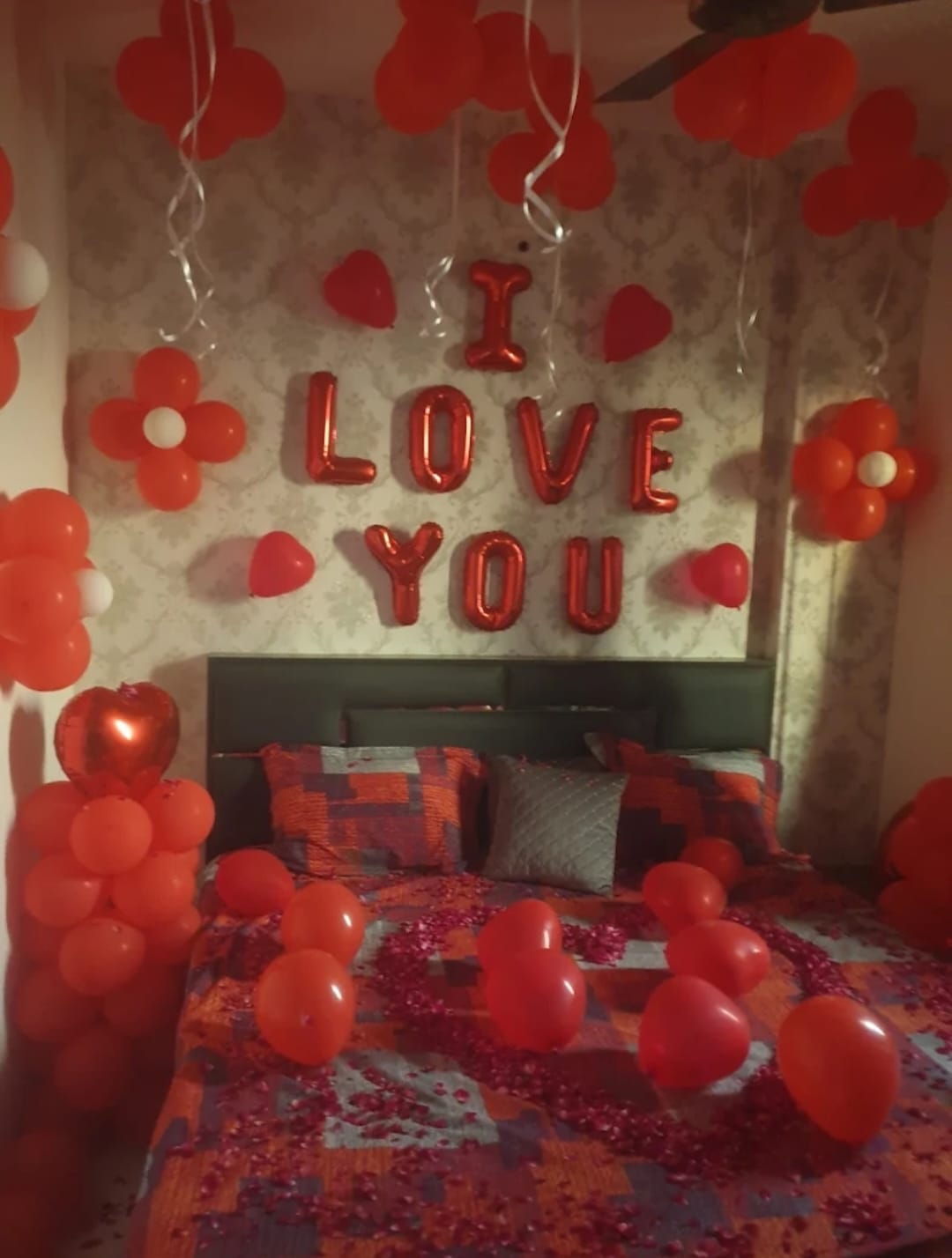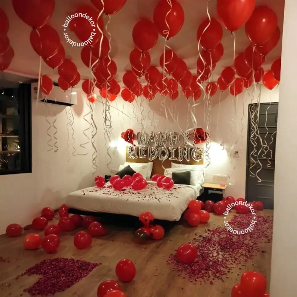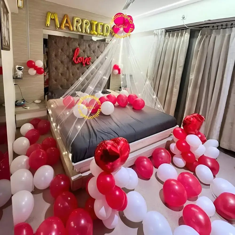 Romantic heart-themed decorations with balloons, lights, and special arrangements for a memorable first night.
